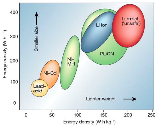 It is widely believed that the most efficient strategy to achieve meaningful reduction in greenhouse gas (GHG) emissions is by electrification of transportation and expanding the use of renewable energy sources. Both of these approaches require transformative energy storage technology [,,,,,]. One of the most promising energy storage technologies is solid-state lithium batteries (LBs) [,,,]. LBs are rechargeable, and they were first introduced on the market by Sony Corporation in 1991 []. One of the key distinctions of LBs is that they have a much higher energy density than conventional nickel-cadmium (Ni-Cd) [], lead-acid (Pb-acid) [], nickel-hydrogen (Ni-H2) [], and silver-zinc (Ag-Zn) [] batteries represented in a Ragone plot (Figure 1).