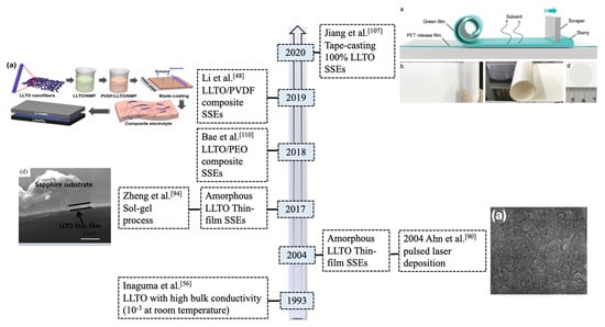 Fabricating thin-film LBs with a pure LLTO matrix only would be an effective way to enhance ionic conductivity. Thin-film LBs with LLTO matrices have large active surface areas and reduced volumes, which increases the charge rates via decreased diffusion lengths of lithium-ions. However, thin-film electrolytes of crystalline-phase LLTO matrices have significant grain boundary resistances and are unstable when in contact with lithium metal due to the reduction reaction of Ti4+ to Ti3+ []. Thus, adjusting the orientation of LLTO grains, or directly replacing the crystalline phase of LLTO with an amorphous one, were found to be effective modifications that resolve these issues and enhance the total ionic conductivity of the SSEs.