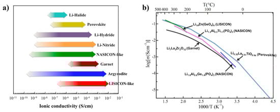 (a) Typical SSEs with highly ionic conductivities at room temperature; and (b) ionic conductivities of selected SSEs with elevated temperature. Reprinted (adapted) with permission from []. Copyright 2017 American Chemical Society.