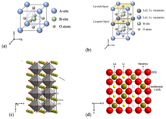 Perovskite La2/3−xLi3xTiO3 (LLTO)-family (0.04 < x < 0.16) with ABO3 structure (Figure 4a,b) has Li, La (La-rich and La-poor regions), and vacancies occupying the A sites, and Ti-ions occupying B sites that are octahedrally coordinated by oxygen [].