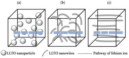 Morphology modification of LLTO (i.e., random or aligned one-dimensional (1D) LLTO nanofibers) is an effective way to improve its total ionic conductivity. Compared with LLTO particles, one dimensional LLTO nanofibers with high surface-to-volume ratios can increase the amount of continuous ion-conducting pathways [,,]. Liu et al. [] reported that 1D Li0.33La0.557TiO3 ceramic nanowire fillers can facilitate the formation of ionic conduction networks in the polyacrylonitrile-LiClO4 matrix to enhance their total ionic conductivity of the resulting SSEs by three orders of magnitude than using nanoparticles (2.4 × 10−4 S cm−1 at room temperature). Figure 5 shows the difference between lithium-ion pathways when using LLTO nanoparticles and nanofibers (i.e., random or aligned) []. Compared with isolated nanoparticles in Figure 5a, random nanowires could supply continuous fast pathways for Li-ion transportation. While compared with random nanowires in Figure 5b, well aligned nanowires in Figure 5c are free of crossing junction. The ionic conductivity for well aligned LLTO SSEs is 6.05 × 10−5 S cm−1 at 30 °C, which is one order magnitude higher than SSEs with randomly aligned nanowires [].