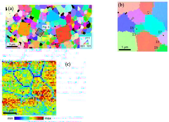 Sasano et al. [] proposed that the grain boundary conductivity can be significantly enhanced by increasing the number of coincidence-site lattices (CSL) at the grain boundaries. For the geometric CSL of the grain boundary, the index is used and the smaller value, the higher lattice coincidence grain boundaries. When values are larger than , the grain boundaries are considered as random. SEM-EBSD crystallographic orientation map and ESM loop area map measured at the same region (the black square as shown in Figure 6a). The higher ESM signal intensity corresponds to the higher Li-ion conductivity (grain boundary of black arrowheads as shown in Figure 6b,c). CSL at the grain boundaries are relatively regular than random regions, which have fewer composition deviations and structural distortions. These results suggested that control geometries of the grain boundaries for the improvement of the Li-ion conductivity in LLTO.