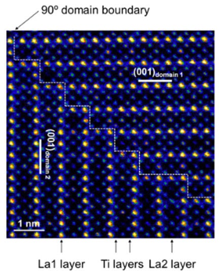 Another contributing factor to grain boundary resistance is the 90° domain boundary that exists between neighboring La-rich regions [] as shown in the Figure 7. Moriwake et al. pointed out that when lithium ions migrate through La-rich layers, an extremely high activation energy (Ea = 3.58 eV) in the 90° grain boundaries significantly blocks the pathways of lithium ions and limits their diffusion [,].