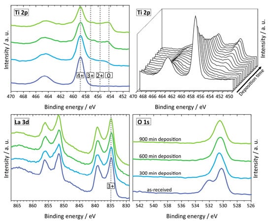 The Ti 2p, La 3d and O 1s detailed spectra for four different deposition times (different amounts of deposited Li metal). Reprinted from [], Copyright (2015), with permission from Elsevier.