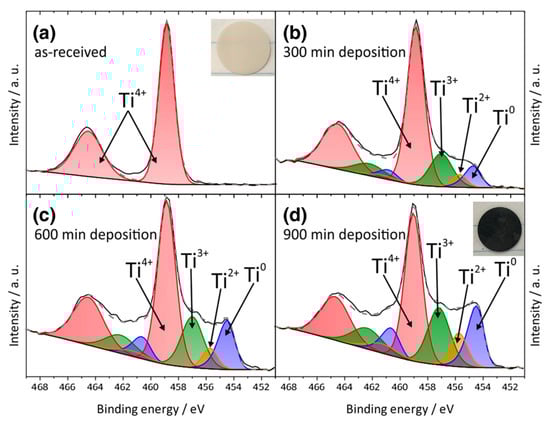 X-ray photoelectron spectroscopy (XPS) detailed spectra of four Ti oxidation states for four different deposition times. Reprinted from [], Copyright (2015), with permission from Elsevier.