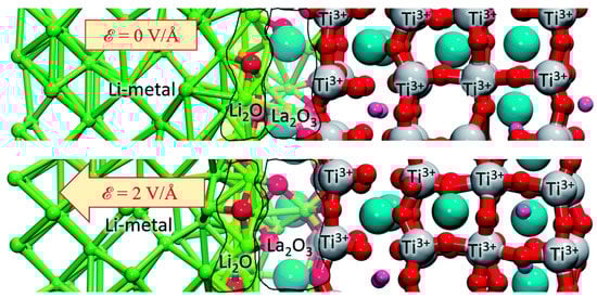 Galvez-Aranda et al. [] used an ab initio molecular dynamics study to propose that lithium-oxide and lanthanum-oxide phases are formed when LLTO is in contact with Li metal. The main reactions at the interface lead to the formation of Li-O and La-O. O comes from the TiO3 structure of LLTO crystal and breaks the original Ti-O bonds. Besides, presence of La at the interphase helps break the Ti–O bonds and create more Li–O bonds. Thus, the formation of lithium-oxide is always faster than the lanthanum-oxide. From a mean square displacement (MSD) analysis, the oxygen atoms migrate at the constant positive rate and keep being displaced toward the Li-metal anode. When applying an external electric field, the formation of both oxides is accelerated as shown in Figure 10.