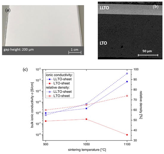 Others aim to increase ionic conductivity of tape-cast LLTO films. Jiménez et al. [] prepared LLTO thick films (sintered at 1100 °C) with bulk conductivity of 1.7 × 10−5 S cm−1 at 300 K. However, incomplete reincorporation of lithium results in less-conducting grain boundary, which decreased dramatically the total lithium conductivity (5 × 10−8 S cm−1 at 300 K). Schiffmann et al. [] casted LLTO pellets and then assembled it with LTO anode into half-cell by co-sintering as shown in Figure 11a,b. LLTO tapes with the thickness of about 25 μm maximizes the ionic conductivity close to 10−3 S cm−1 at sintering temperature of 1100 °C (as shown in Figure 11c). Employing a lamination process ensures the formation of close and homogeneous interface between LLTO and LTO during co-sintering.