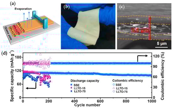 (a) The schematic illustration of the sandwiched SSE preparation by blade casting; (b) digital photograph of the bent sandwiched SSE; (c) the cross-sectional FE-SEM image of sandwiched SSE; and (d) battery performances of all-solid-state LMBs at 25 °C: Long-term cycling of assembled cell at 1C. Reprinted from [], Copyright (2020), with permission from Elsevier.
