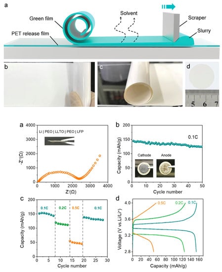 Jiang et al. [] fabricated tape-cast ceramic LLTO film with a reduced thickness of 25 μm. Figure 13 shows fabrication for tape-casting methods and related battery performance. The total Li ionic conductivity was improved to 2.0 × 10−5 S cm−1 compared to a thick electrolyte (>200 μm) prepared by cold-pressing. Symmetric Li|PEO|LLTO-41 (41 μm is the thickness of LLTO pellet) | PEO |Li cell was assembled to obtain the Nyquist plot. The aid of PEO electrolyte coating could avoid reduction of Ti element and alleviate contact between Li metal and electrolyte. In this way, the total resistance of a symmetrical cell was reduced to about 2250 Ω. Galvanostatic stripping and plating was performed on a symmetrical Li cell to evaluate the long-term interface stability. After 20 cycles, the original overpotential of 67 mV at 0.025 mA cm−2 was reduced to a relatively stable value of 26 mV. The average overpotential increased to 100 mV at 0.1 mA cm−2. The stable overpotential remained to 54 mV at 0.05 mA cm−2. Li|LFP full cell was successfully assembled and exhibited good battery performance. The initial discharge capacity was 145 mAh g−1 at current density of 0.1C and a capacity retention of 86.2% after 50 cycles.