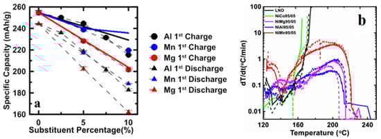 (a) Initial discharge capacity as a function of Al, Mn, and Mg percentage; and (b) self-heating rate of the delithiated LiNiO2 and LiNi0.95M0.05O2 (M = Co, Mg, Al or Mn) [8].