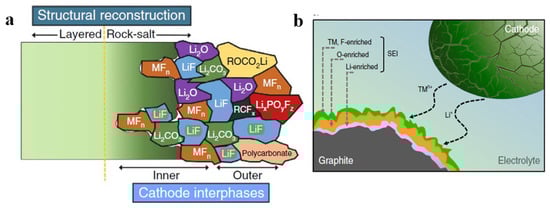 The discussion of promising high-Ni NMC-layered material has been outlined, mainly reducing the cost, increasing the capacity, and reducing the risk on the supply of cobalt. However, the cathode lifetime is limited because of its structural degradation on the sub-surface of high-Ni NMC. The degradations change the interfaces and properties. It is widely known that higher cut-off potential and elevated temperature are responsible for the degradation of the high-Ni NMC [37,38,39,40]. It has been reported that in in situ XRD experiments with a slow enough rate of C/50, the lattice parameter of LiNi0.8Mn0.1Co0.1O2 (NMC811) appears to have a non-monotonic dependence on the Li content, and the lattice changes thus become highly anisotropic [41]. A comparative study conducted by Kondakov et al. [38] indicates that the volume changes in NMC811 are more significant than those of LiNi1/3Mn1/3Co1/3O2 (NMC111) at a potential between 4.0 and 4.3 V. The temperature of the battery comprised with high-Ni NMC should be closely monitored because it is directly related to the safety of the battery operation. At a high SOC, the spontaneous reduction of Ni4+ to Ni2+ during heating accompanied by the release of oxygen causes the destruction of the original structure [18,42,43]. Nevertheless, the current research shows that intrinsic degradation leads to subsurface structural changes and some deposited products presented in Figure 4a. The structural degradation of the layered structure becoming a rock-salt structure on the surface leads to a limited diffusion for Li+. Other degradation mechanisms include metals dissolution, oxygen release, and surface reaction with electrolyte, leading to a release of CO/CO2 [44]. In many cases, the dissolution of the transition metals (TMs) from the bulk diffuses into the anode and thickens the SEI on the anode, as shown in Figure 4b. In addition to the degradation that originated from the cathode, the degradation can also occur from the trace of water. Water traces react with the electrolyte, LiPF6, and form HF. This leads to the acid attack of TMs by the HF [45].