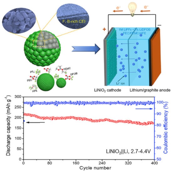 In situ formation of F and B-rich SEI layer on cobalt-free LiNiO2 and long-term cycling ability and Coulombic efficiency over 400 cycles at 0.5 C. [95].