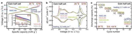 Electrochemical performance of NMA89 compared with NMC89, NCA89 and NCMAM89. (a) Galvanostatic charge-discharge profile curves at 0.1 C, (b) dQ/dN curves, and (c) rate capability performance. Image is adapted with permission from authors [96]. Reproduced from Advanced Materials, the name of the publisher: John Wiley and Sons.