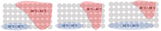 Interesting results can be extrapolated from the research of Xu et al. [22]. In a parallel flow arrangement, the air flows parallel to the battery cells and is expelled by the fans from the air-outlets. The highest temperature areas are inside the battery near the air-outlet. With this configuration, the heat dissipation performance requirements are not satisfied with any of the environmental temperatures considered ( = 20 C, = 27 C, = 40 C).