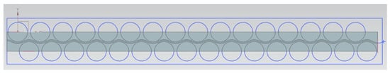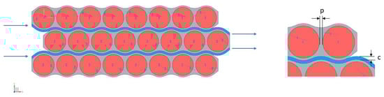 The battery arrangement studied in this section is a hybrid solution with staggered cylindrical cells embedded in solid support and cooled by a fluid that flows in wavy channels. This study is part of a deep investigation of the performances of battery packs conducted by our research group in the automotive field, with dedicated experimental campaigns in which the theoretical results shown in this work are deployed and validated in the laboratory. The novelty of this solution is the strict coupling of solid plastic matrix and channels for liquid cooling [57]. The geometry of a portion of the hybrid solution is shown in Figure 3.
