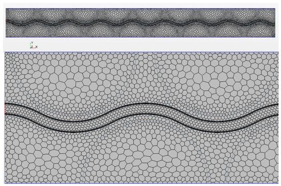 The real geometry of the battery is obtained by repeating periodically this part in the direction perpendicular to the flow. The number of cells in the direction parallel to the coolant flow was varied from 8 to 16 to show the linear behavior of the cell temperature as a function of the distance from the coolant inlet. In the present paper, the cells have a format 21,700, but the approach can be easily up-scaled to cells with a different format. The Li-ion cells are considered as made by homogeneous material with density 2680 kg/m, thermal conductivity W/(m K), and heat capacity 1280 J/(kg K). Two materials are compared for the cell support, a common plastic with thermal conductivity W/(m K) and density 1380 kg/m (here called “plastic 1”), and a conductive plastic with additives with thermal conductivity W/(m K) and density 1450 kg/m (here called “plastic 2”). The two materials have specific heat 1100 J/(kg K). These values refer to plastic material that are used in our laboratory to realize the support for the cell in the battery pack. The CFD code STAR-CCM+ has been employed to solve the steady-state Reynolds-averaged Navier–Stokes (RANS) equations with realizable k- turbulence model. Bidimensional meshes with polygonal elements have been created for each configuration, as shown in Figure 5.