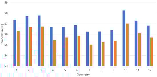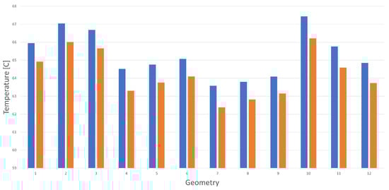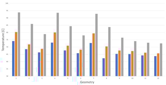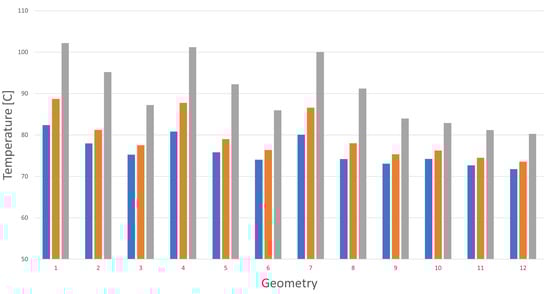 The figure shows that the maximum temperature of the cells increases as the channel width c increases and decreases as the axial distance p between the cells increases. The best geometry is n. 7, with mm and mm. These results can be compared with the results obtained with plastic 2 with the same geometry, as summarized in Figure 11.
