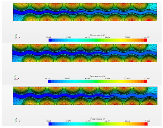 Temperature of the cells obtained for the case of geometry n. 12 and air as cooling fluid. Inlet velocities are m/s (top), m/s (middle), and m/s (bottom).