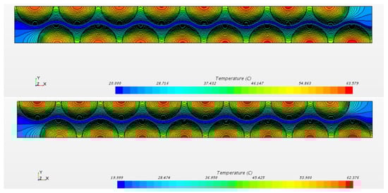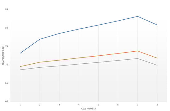 The Figure 10 and Figure 11 show similar trends but the values of the maximum temperature are about 6–7 C lower with the plastic 2. The best geometry with water cooling is the n. 7, i.e., the one with the smallest channel. The temperature difference on the cells for the geometry n. 7 is shown by Figure 12 for the case of plastic 1.