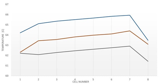 Temperature of the cells as a function of the cell number, obtained for the case of channel width mm and water as cooling fluid. The distances between the cells are mm (blue line), mm (red line) and mm (grey line).