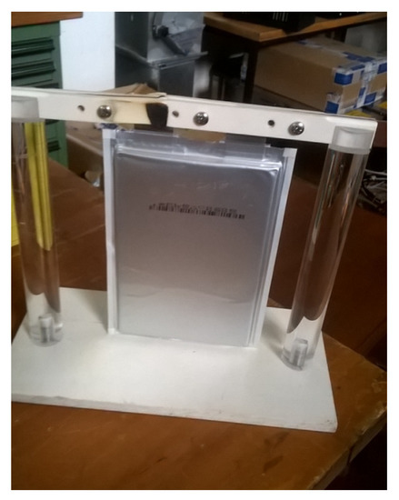 The purpose of the tests is to investigate the effect of some external factors on battery life. In particular, life tests were performed by varying the intensity of the discharge current and the depth of discharge. There are many parameters that influence the life duration of a cell, including charge current and temperature. However, finite time and equipment resources limited the number of stresses analyzed. Since we focus on stationary applications, charge current and temperature are the same in all the tests. The tests are performed on EiG PLB C020 20 Ah cells, which are lithium-ion-polymer batteries with a cathode NMC technology, graphite at the anode, and a pouch structure (see Figure 1).