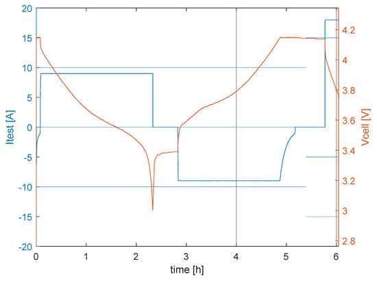 A typical discharge–charge profile for an applied current of 0.5 C, is reported in Figure 2. The current is calculated on the actual initial capacity value rather than on the 20 Ah nominal value. For all the tested cells, the initial capacity was always smaller than the nominal one, with an average value of 19 Ah, and a standard deviation for the population of 0.4 Ah.