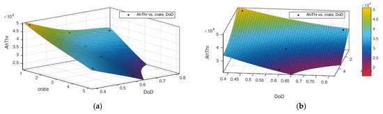 Figure 3 graphically shows the relationship between the amount of cumulative charge supplied until reaching the EOL condition (C/C0 = 0.8), and the stress factors analyzed for cells B1–B8. The experimental points are represented as black dots on the surface.