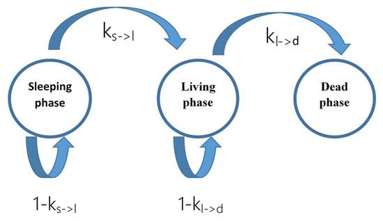 The proposed model has its base on the work by Risse et al. [28], in which the battery capacity degradation process is represented by a Markov chain consisting of three phases and four states, capable of capturing the phenomena that occur during the aging of a battery, including the initial formation. A Markov chain is a mathematical representation of a stochastic system that evolves with transitions from one state to another, according to certain probabilistic rules. In Markov chains, the transition probabilities do not depend on the system history. In the present work, we are not interested in the formation phase, so we can reduce the model to three phases: the sleeping phase , which represents the portion of the bound charge that can be converted into the active phase during cycling; the living phase , which represents the capacity immediately available; and the dead phase , which represents the portion of material no longer available for cycling. Once the active materials are transferred from the active state to the dead state, they can no longer be used in the charging and discharging processes. The dead state is thus an absorbing state. The system state is a combination of the three phases. The initial state is defined as the vector reported in (3):