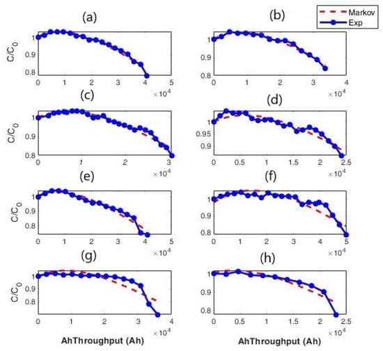 As it can be seen from Figure 5, for the batteries with a lower stress intensity (the cells from 1 to 6), the Markov model can catch the main features of the experimental curve. However, the deviation from the experimental data is relevant in the case of the stronger stress (cells 7 and 8), especially toward the EOL.