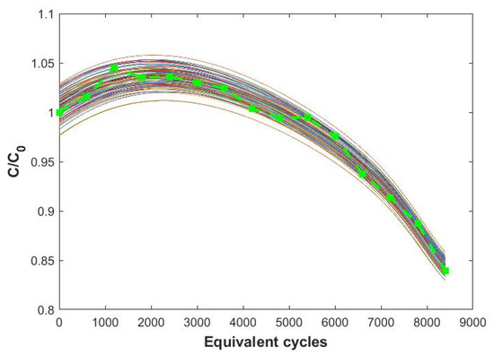 The results are shown in Figure 6, for the B2 battery. The simulation was made for a sample of 100 initial values of and and, for comparison, the experimental curve is also shown (in green with round symbols). It can be seen that the curves tend to converge as the number of equivalent cycles increases, indicating a limited influence of the values of the 2 parameters in the final part of life (variation of less than 2% in the cases examined). We can therefore consider that the error introduced by setting the value of and is irrelevant for determining the end of life.