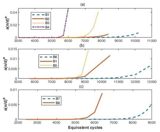 Curves for the exponential term of the transition matrix (8), as a function of the equivalent cycles and for different cells: (a) comparison among cells from number 1 to 4; (b) comparison among cells number 6, 1 and 5; (c) comparison between cell number 7 and cell number 8.