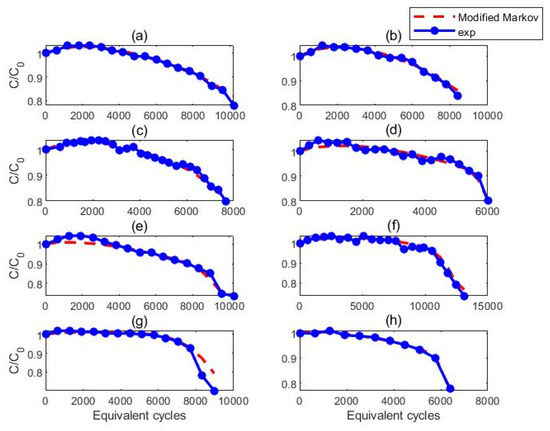 Comparison between the experimental data and the model (8), as a function of the number of equivalent cycles: (a) battery number 1; (b) battery number 2; (c) battery number 3; (d) battery number 4; (e) battery number 5; (f) battery number 6; (g) battery number 7; (h) battery number 8.