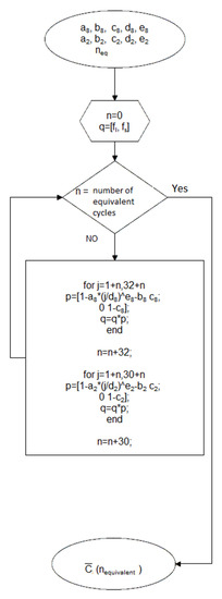 Furthermore, Figure 9 reports the results of the life simulation obtained by evaluating the parameter of model (8) on the experimental data of battery 9. The model reproduces well the experimental data. However, our aim is to estimate the capacity degradation for battery 9 using data from single stress tests. Figure 10 shows the flowchart of the program: as the input, we have the parameters from the experimental data for B2 and B8, as well as the fixed values of and . These represent the initial values of the vector q, which coincides with the initial state of the system whose third component, not shown, represents the dead phase. The parameters of the batteries B8 and B2 were appropriately inserted in the transition matrix (8), which was then used in the algorithm, represented by the loops shown in the flowchart. The output is the capacity of the battery after equivalent cycles. In this way, it is possible to obtain the simulation of the decay of the capacity of B9.