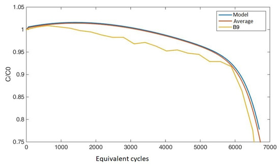 Degradation curve of the capacity for cell B9 with respect to the number of equivalent cycles and the comparison between the predictions of the model (8). For comparison, the curves of batteries 8 and 2 are shown.