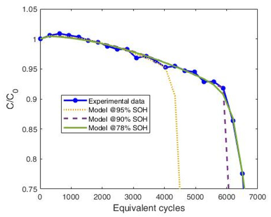 We compare the result of the proposed extrapolation approach with those obtained using the model (8), with parameters evaluated at different states of health (SOH). SOH is defined as the ratio between the capacity after n cycle and its initial value: