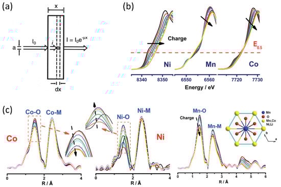 Figure 3a shows the schematic diagram of hard XAS in transmission mode. Compared with XPS, which only probes the surface less than a few nm, hard XAS provides bulk information. Therefore, hard XAS has been widely applied to determine the oxidation state and geometry of 3d/4d transition metals. Typical K-edge XAS spectra explored for Li-rich layered cathodes include Ni, Co, Mn, and Ru.