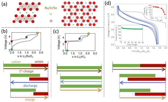 - Kobayashi, H.; Kanno, R.; Tabuchi, M.; Kageyama, H.; Nakamura, O.; Takano, M. Structure and Charge/Discharge Characteristics of New Layered Oxides: Li1.8Ru0.6Fe0.6O3 and Li2IrO3. J. Power Sources 1997, 68, 686–691. [Google Scholar] [CrossRef]