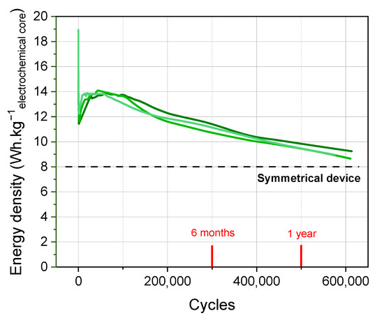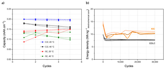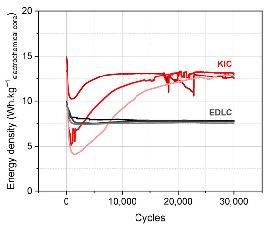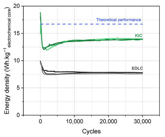 Initially, the formation protocol used for the KIC system consists of five successive galvanostatic charge/discharge cycles at 0.82 mA·cm−2 (5C, with C being the capacity of the cell) at room temperature. The performance of the KIC cells that undergo this initial formation protocol, and those of the conventional EDLC, are presented in Figure 1 for a batch of three cells. A flow chart of cycling tests is presented in Figure S3. The energy densities are expressed per kilo of electrochemical core, the detailed description of which is given in the Supplementary Data.