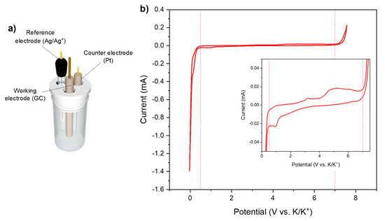 (a) Three-electrode set-up used for measurement; (b) Electrochemical stability window of acetonitrile (WE = GC; RE = Ag/Ag+; CE = Pt) with a 1.0 mol·L−1 KPF6 salt.