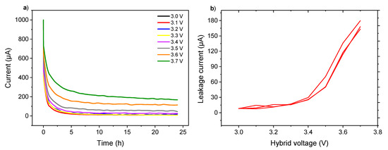 Figure 4a shows the currents of the KIC cells recorded at the constant-voltage steps. The residual current after 24 h at constant voltage, named the leakage current [28], was determined to evaluate its evolution with the applied voltage, as can be seen in Figure 4b. For the readability of the figure, Figure 4a presents the curves for a single cell while Figure 4b shows the results obtained for the batch of three cells.