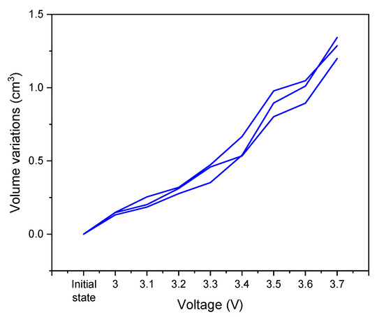 The general trend of the curve is a gradual increase in the cell volume, and this seems to intensify at a high voltage. Regardless of the cell voltage, the reactions that take place within the cells result in the generation of gases, causing the cell swelling.
