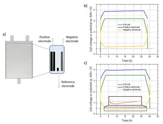 First, the hypothesis on the degradation of the electrolyte at a high cell voltage was evaluated. In order to do that, it is necessary to know the potential of the negative electrode to see if it drops below 0.5 V vs. K/K+. The three-electrode set-up with an additional reference electrode were then assembled, as shown schematically in Figure 6a. Considering the previous results, tests with this set-up were carried out for a voltage chosen in each of the following windows: 3.0–3.4 V and 3.5–3.7 V. Figure 6 shows the cell voltage and potentials vs. K/K+ of the positive and negative electrodes for the constant voltage tests, described previously, at 3.2 V (Figure 6b) and 3.5 V (Figure 6c). Each test was carried out on a batch of three cells in order to ensure the reproducibility of the results.