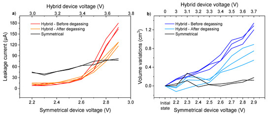 In addition, a comparison between the symmetrical and hybrid device was carried out to decorrelate the phenomena taking place at the negative electrode and at the positive electrode. Each electrode can have a passivation layer [34], SEI at the negative side, and CEI at the positive side, giving rise to the generation of gas. Comparing the evolution of the cell volume in the symmetrical and hybrid configurations would therefore make it possible to identify at which electrode the degradation reactions take place. Symmetrical cells with two activated carbon electrodes were then assembled. To take into consideration the same degradation reactions, the same electrolyte is employed for both the hybrid and symmetrical devices. The operating voltage range of a KIC is up to 3.5 V, and the study was performed for voltages between 3.0 and 3.7 V. To keep the same logic and knowing that the operating voltage range of the EDLC studied is up to 2.7 V, constant voltage tests and volume measurements were performed on voltage ranges from 2.2 to 2.9 V for the symmetrical device. The evolutions of the leakage current and the volume variations of the cells with the applied voltage are shown on Figure 7 for a batch of two symmetrical cells.