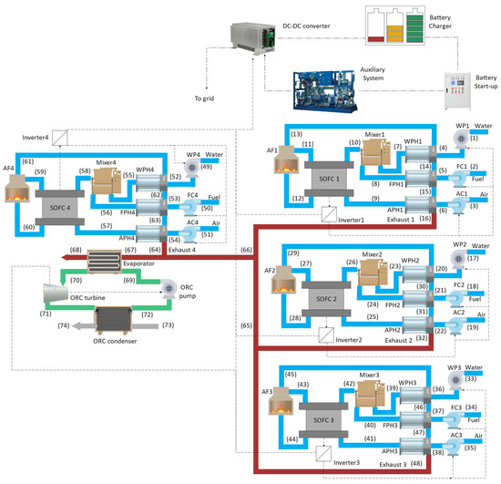- Selvam, K.; Rokni, M.M.; Komatsu, Y.; Sciazko, A.; Kaneko, S.; Shikazono, N. Design point analyses of solid oxide fuel cell-steam cycle combined system: Effects of fuel reforming and bottoming cycle steam parameters. Int. J. Energy Res. 2022, 46, 10844–10863. [Google Scholar] [CrossRef]