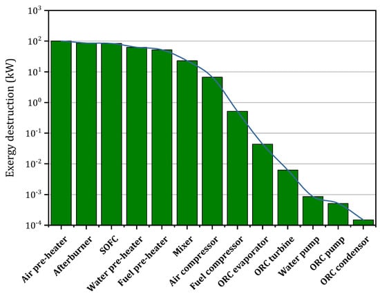By the calculation of the exergy values using Table 1, Table 3, and Table 4, the prediction of the exergy destructions in each component of the system becomes feasible. In this regard, important information about the efficiencies and the irreversibilities of each component of the system are obtained, which enables improved monitoring of the system. Figure 2 shows the corresponding figure of the exergy destructions in each component of the system. As it can be seen, the air pre-heaters of the SOFC stacks have by far the highest exergy destruction values followed by the afterburners, where the combustion of the unreacted exhaust gases from the SOFC stack occurs. The results of Figure 2 also clearly indicate the low exergy destruction values in the related components to the ORC unit in comparison to the SOFC stacks.
