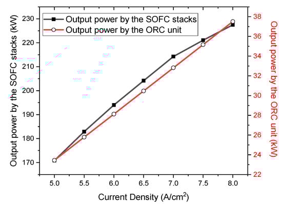 The changes in the output powers of the SOFC stacks and the ORC unit by the variation in the SOFC’s current density.
