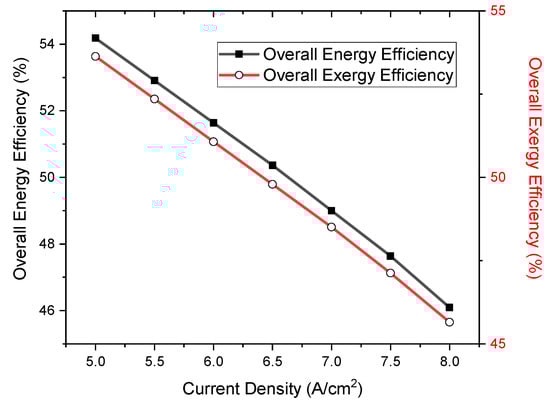 The changes in the overall efficiencies by the variation in the SOFC’s current density.