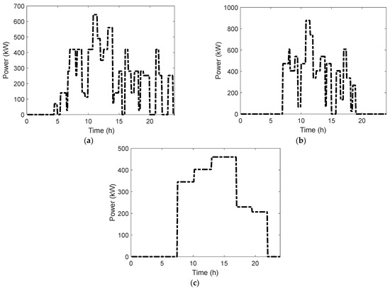 Three different power demand profiles of the proposed system: (a) first power load profile, (b) second power load profile, and (c) third power load profile.