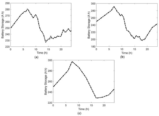 The changes in the storage of battery in different power demand profiles of the proposed system: (a) first power load profile, (b) second power load profile, (c) third power load profile.
