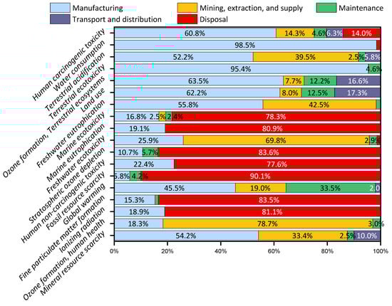Additionally, the given LCA methodology and the eighteen impact categories, which were mentioned in Table 8, are characterized by five main input categories, namely, (1) manufacturing, (2) mining, extraction, and supply, (3) maintenance, (4) transport and distribution, and (5) disposal. Figure 7 illustrates the shares of the five input categories on the environment during the operation of the 246.02 kWh charging station. As it can be seen, manufacturing has by far the largest share of global warming, human carcinogenic toxicity, water consumption, terrestrial acidification/ecotoxicity/ecosystems, land use, freshwater eutrophication, and mineral resource scarcity. Figure 7 also indicates that the disposal has the main shares in marine ecotoxicity/eutrophication, stratospheric ozone depletion, human non-carcinogenic toxicity, fossil resource scarcity, fine particulate matter formation, and ionizing radiation. Furthermore, mining, extraction, and supply has the largest impact on freshwater ecotoxicity and ozone formation, human health.